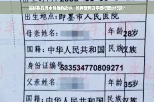 摘要:本文将介绍如何查询四年的银行流水记录,并揭示这些记录背后的故事。通过简单的步骤,您可以了解自己的账户交易情况,包括收入、支出等重要信息。了解如何查询银行流水,有助于您更好地管理个人财务,确保账户安全。阅读本文,您将学会如何轻松查看银行流水记录,并深入了解其中的细节。