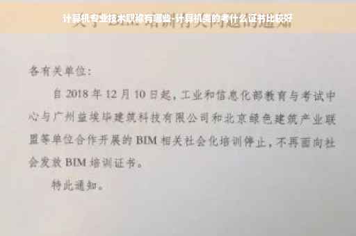 计算机专业技术职称有全国计算机信息高新技术考试,全国计算机信息高新技术证书作为反映计算机操作技能水平的基础性职业资格证书,在要求计算机操作能力并实行岗位准入控制的相应职业作为上岗证;在其它就业和职业评聘领域作为计算机相应操作能力的证明。