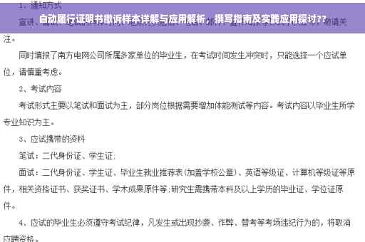 摘要:本文将介绍自动履行证明书撤诉样本的撰写方式及其实际应用解析。通过本文,读者将了解到如何正确书写自动履行证明书撤诉样本,包括其格式、内容、关键要点等。还将探讨该样本在实际应用中的使用场景、注意事项和可能遇到的问题,以帮助读者更好地理解和使用该样本。