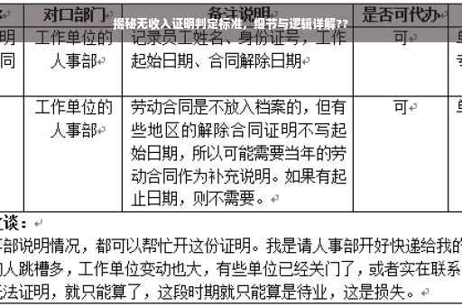 摘要:本文将揭示无收入证明的判定标准,深入探讨其细节与逻辑。通过解读相关标准,帮助读者了解无收入证明的具体定义和判定依据,以便更好地应对相关情况。文章将带领读者深入了解无收入证明背后的真相,并提供有益指导。