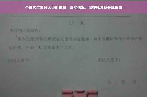 摘要:本文将介绍个体店工资收入证明的重要性,揭示真实情况与潜在机遇。通过了解如何开具个体店工资收入证明,帮助个体店主更好地展示自身经济实力和信誉。本文将简要介绍开具收入证明的步骤和注意事项,同时探讨个体店主在展示收入证明时面临的机遇与挑战。