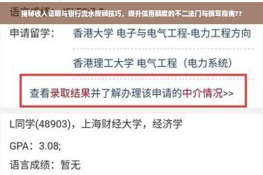 摘要:本文将揭示如何通过优化收入证明和银行流水记录来提升信用额度。通过深入了解收入证明的具体要点和如何有效展示银行流水记录,本文将指导读者掌握提升信用额度的关键技巧。本文旨在帮助个人在财务领域建立良好信誉,顺利获取更高的信用额度。阅读本文,将助您轻松提升信用额度,实现财务目标。