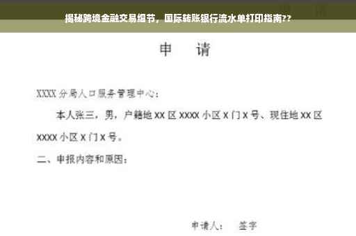 随着全球化的不断发展,跨境金融交易变得越来越普遍,无论是个人还是企业,在进行海外投资、购物、收款等操作时,银行流水单成为了记录这些交易的重要文件,本文将详细介绍国际转账银行流水单的相关知识,帮助您更好地了解跨境金融交易的全过程。