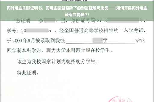 随着全球化的不断发展,跨境金融交易日益频繁,越来越多的人开始关注海外资产管理和财富增值,在这样的背景下,海外送金余额证明书作为一种重要的金融文件,不仅用于证明个人或企业在海外的资产状况,还体现了跨境金融的新趋势和挑战,本文将详细解读海外送金余额证明书的概念、作用,分析其背后的金融趋势与挑战,并探讨如何有效应对这些挑战。