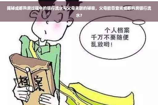 摘要:关于成都购房过程中银行流水与父母的关系,揭秘银行流水是否可查询父母的记录。在购房贷款时,银行会要求购房者提供银行流水以评估还款能力,而父母的银行流水在某些情况下也可能被考虑。具体能否查询父母的银行流水,需根据银行政策和具体情况而定。