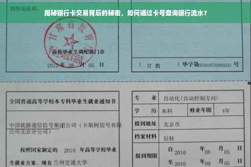 摘要:本文将介绍如何通过卡号搜索银行流水,揭示个人与银行交易背后的秘密。通过简单的方法,您可以了解自己的账户交易情况,包括收入、支出等详细信息。本文将指导您如何操作,以便更好地管理您的财务。