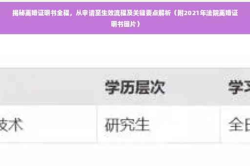 摘要:本文以2021年为例,详细解析了离婚证明书的全过程,包括申请、审批和生效等环节。文章介绍了关键要点,包括离婚双方的申请材料准备、法院的审核流程和注意事项等。提供了相关的图片辅助理解。通过阅读本文,读者可以全面了解离婚证明书的申请流程和要点。