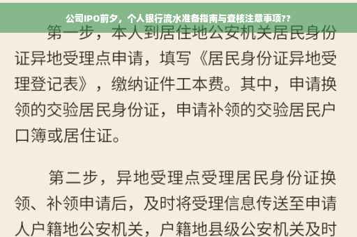 摘要:在公司IPO前,个人银行流水准备至关重要。需提前准备并核查个人银行流水账单,确保其真实、完整、连续。注意事项包括避免流水账单造假、注意隐私保护及资金流动合理性。查询个人银行流水可通过网银、手机银行或柜台查询。了解流程,确保顺利,为公司IPO进程打下良好基础。