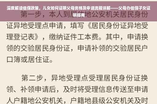 摘要:本文将深度解读低保政策及其申请流程,探讨儿女如何证明父母符合低保资格的问题。涉及内容包括低保政策的目的、申请条件、申请流程以及子女在证明父母资格时应提供的材料。文章旨在为需要申请低保的家庭提供指导,帮助他们了解并正确操作申请流程。