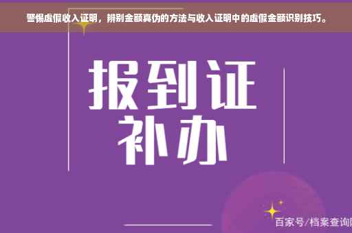 摘要:,,警惕虚假收入证明,辨别金额真伪至关重要。识别虚假收入证明需注意文件格式、纸张质量、签名及印章真伪等细节。对于金额真伪,可对比官方记录、核实税收缴纳情况等。收入证明中的虚假金额描述通常表现为数字字迹异常、格式不规范等。务必谨慎核查,避免被虚假证明误导。