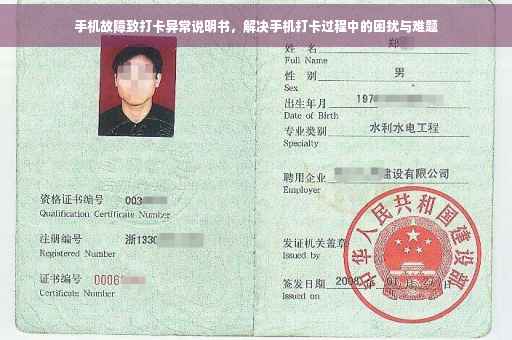 摘要:,,关于手机故障导致无法打卡的情况说明书,主要内容应包括个人基本信息、手机故障具体情况、无法打卡的时间段以及采取的解决措施。可简述故障现象如屏幕失灵、系统错误等,并声明已尝试的修复方法。最后表达对此造成的不便深感抱歉,并承诺未来会按时打卡。字数控制在100-200字之间。