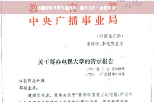 诊断证明书是医疗文件的一种,用于证明患者因某种疾病或状况需要休息或接受特殊医疗处理,在现代社会,诊断证明书的重要性日益凸显,不仅关乎个人健康,更涉及到工作、学习等多个领域,很多人关心诊断证明书可以开几天这个问题,本文将详细解析诊断证明书的有效期时长,帮助大家了解相关规定和注意事项。