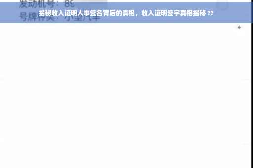 摘要:本文将揭示收入证明人事签名背后的真相,探讨收入证明签字的重要性及其背后的含义。通过深入了解收入证明签字的流程和细节,揭示可能存在的风险和问题,提醒读者在签署收入证明时需要注意的事项,以保护自己的权益和利益。本文还将介绍一些相关的知识和注意事项,帮助读者更好地了解和处理与收入证明相关的问题。