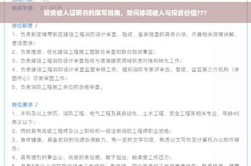 在当今社会,投资理财已成为越来越多人关注的焦点,随着经济的发展和个人财富的增长,越来越多的人开始关注如何通过投资实现财富的增值,收入体现的投资证明书作为一种重要的投资证明工具,对于投资者而言具有非常重要的意义,本文将详细介绍收入体现的投资证明书的相关内容,帮助读者更好地了解其作用和重要性。