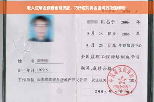 摘要:面对收入证明金额低导致的贷款难题,有多种策略可巧妙应对资金困境。可通过提供其他财务证明,如银行流水、资产证明等,来弥补收入证明的不足。选择担保贷款或抵押贷款,增加贷款成功几率。规划个人财务,提高收入稳定性,并寻求专业贷款顾问的建议,也是解决资金困境的有效途径。