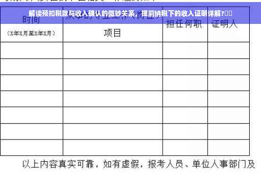 在我们的日常生活中,税收是一个不可忽视的重要话题,对于企业和个人来说,了解税收的相关概念和规定,对于合理规划财务、避免法律风险具有重要意义,本文将重点探讨“提前纳税”这一概念,并解读与之相关的收入证明问题,帮助读者更好地理解预扣税款与收入确认之间的关系。