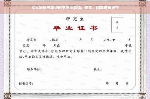 摘要:军人复员三本证明书是军人退役时的重要证明文件,包括《义务兵退出现役证》、《退伍军人证明书》和《退出现役行政介绍信》。这些证明书详细记录了军人的服役情况、退役时间和安置情况等,是军人退役后办理相关手续、享受相关待遇的重要依据。