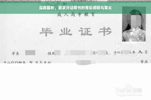 摘要:要求开证明书的原因多样且深远。在日常生活和工作中,证明书具有证明个人身份、资格、经历或事件真实性的重要作用。其背后反映了社会对于事实和证据的重视,确保信息的真实可靠。无论是学业、职业还是法律事务,证明书都是证明个人权益和事实真相的关键文件。要求开证明书是为了确保公正、公平和合法,维护个人权益和社会秩序。