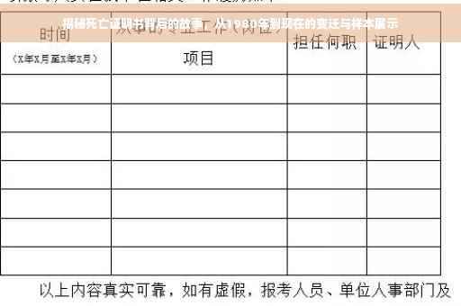 死亡证明书,作为记录生命终章的重要文件,详细记录了逝者的基本信息以及死因等关键信息,它不仅为逝者家属处理丧事提供了重要依据,更是社会医学统计和公共卫生管理领域宝贵的数据来源,自上世纪以来,随着医学的进步和人口管理的需求,死亡证明书的规范化、标准化逐渐得以实施,而1980年,这个充满变革的年代,见证了死亡证明书的重要变革。