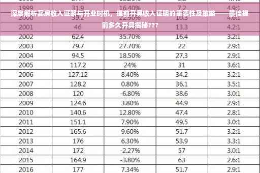 摘要:本文将探讨买房收入证明与开业时机之间的关系,深度解析提前开具收入证明的重要性和策略。文章指出,提前准备收入证明对于购房者和创业者来说至关重要,有助于把握最佳购房时机和开业时机。本文将详细介绍收入证明可以提前多久开具,并提供相关建议和注意事项。