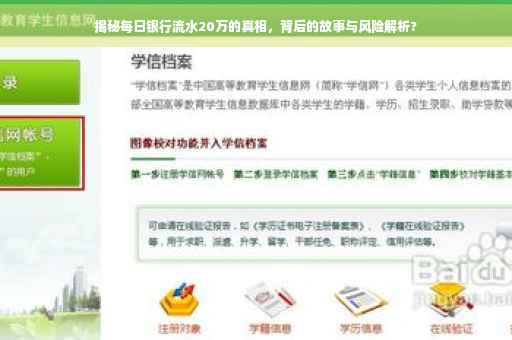 每天银行流水20万背后隐藏着许多故事和真相,这背后代表着个人或企业的辛勤努力、金融市场的投资成果以及多元化的收入来源,实现这一目标并非易事,需要付出努力、承担风险并遵守法律法规,我们应该理性看待金融现象,根据自己的实际情况制定合理的金融计划,同时提醒大家,在任何金融活动中都要注重风险控制和合法合规。