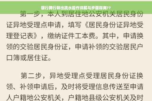摘要:本文将详细介绍银行跨行转出流水的步骤。从选择转账银行、登录网银或手机银行,到填写转账信息、确认收款账户和转账金额,再到完成转账并保存相关凭证,本文将一一阐述。读者将了解到如何便捷、安全地完成跨行转账操作。