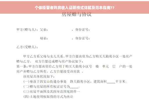 摘要:,,本文将详细介绍个体经营者购房收入证明格式范本,指导个体经营者如何撰写买房收入证明。文章涵盖收入证明的主要内容,包括个人基本信息、经营情况、收入来源及金额等。本文还将简要介绍撰写时需注意的事项,以帮助个体经营者顺利开具购房收入证明,顺利购房。