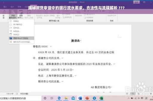 摘要:申请房贷过程中,需要提供银行流水作为按揭要求的一部分。银行流水是证明个人收入状况的重要依据,也是银行评估贷款申请人还款能力的重要参考。本文将揭秘申请房贷过程中的流水关卡,探讨做按揭要求银行流水的合法性,帮助读者更好地了解并顺利申请房贷。
