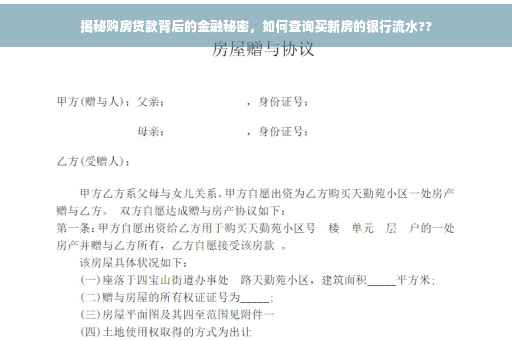 摘要:本文将介绍购买新房时银行流水的重要性,并揭示购房贷款背后的金融秘密。通过查询银行流水,可以更好地了解个人财务状况和贷款申请情况。本文将指导读者如何查询银行流水,以便在购房过程中做出明智的决策。