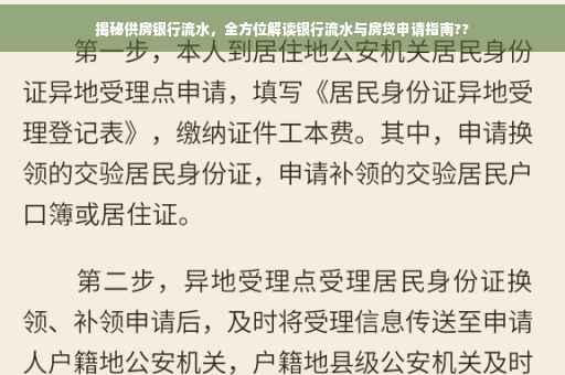摘要:本指南全面解析了供房银行流水与房贷申请的相关内容。详细介绍了供房银行流水的含义,包括其作为评估房贷申请的重要依据。指导读者如何准备和提供有效的银行流水记录,以顺利申请房贷。对于想要了解银行流水与房贷申请流程的读者,本指南提供了全方位的帮助。