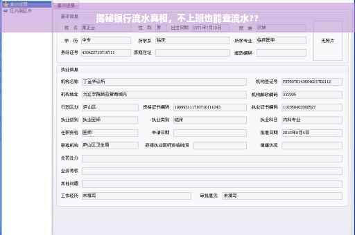 摘要:本文将揭示没上班的银行流水的真相,为读者提供查询方法。通过简单的步骤,了解如何查询个人银行账户中的流水记录,包括收入、支出等详细信息。提醒读者注意保护个人隐私和账户安全,确保查询过程中不泄露个人信息,避免遭受不必要的损失。