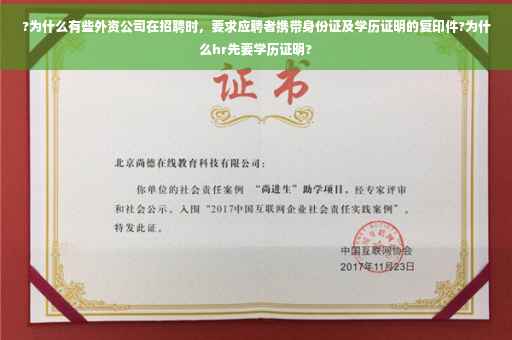 公司在招聘时,要求应聘者携带身份证和学历证明复印件主要是要核对应聘者的信息是否属实,因为公司在招聘时,都会说明某个岗位职责,需要些什么条件,比如需要的学历、专业限制,而身份证、学历证明是对自己身份以及学历最直接的证明。