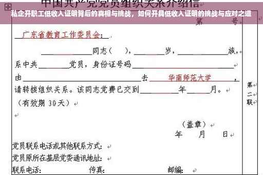随着经济的发展和就业形势的多样化,私营企业已成为众多劳动者的就业选择,在私企工作的职工在面临贷款、购房、子女入学等需要证明收入的情况时,却遭遇了一些困境,职工低收入证明的问题尤为突出,本文将深入探讨私企开具职工低收入证明的现状、原因以及面临的挑战,揭示背后的真相,以期引起社会各界的关注和思考。
