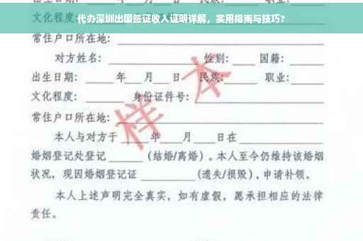 摘要:本篇文章是关于代办深圳出国签证收入证明的实用指南,深度解析了如何撰写一份符合要求的收入证明。文章提供了详细的步骤和注意事项,帮助读者了解在办理出国签证时如何正确准备和提交收入证明。通过本文,读者可以了解到收入证明的重要性以及如何提高办理签证的成功率。