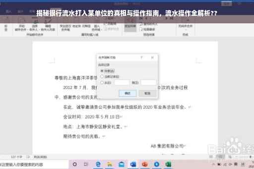 摘要:本文将揭示银行流水打某个单位的真相,并为您提供操作指南。通过简单的步骤,您将了解如何打印银行流水,包括准备相关文件、选择正确的银行渠道等。本文旨在帮助您轻松获取所需的银行流水,并了解其中的细节和注意事项。