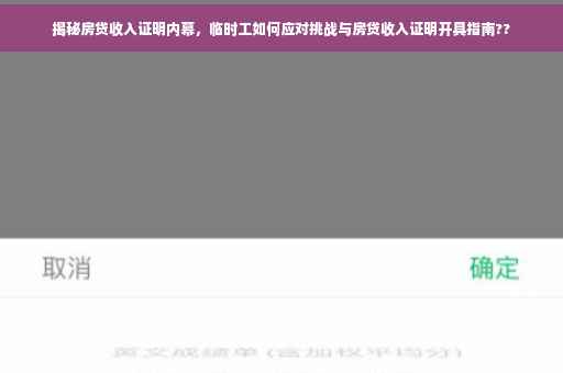 摘要:本文将揭示房贷收入证明背后的真相,探讨临时工如何面对房贷的挑战。文章指出,临时工在申请房贷时,收入证明是一大难题。本文将提供解决方案,包括如何准备充分的材料证明自身收入状况,以及寻求雇主或相关机构的协助等。阅读本文,将帮助临时工更好地应对房贷申请中的难题。