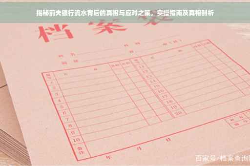 摘要:想要查前夫的银行流水以揭示背后的真相,可采取以下方法:收集证据并确保合法授权;联系银行申请查询或委托律师协助。揭秘真相后,应冷静应对,沟通解决,必要时可寻求法律帮助。注意保护个人隐私,避免侵犯他人合法权益。