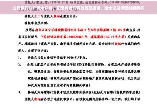 摘要:本文将详细介绍公司银行帐户流水,包括如何正确解读与高效管理。通过本文,您将了解银行帐户流水的含义、作用以及如何分析流水账单,从而优化财务管理。本文还将探讨公司银行帐户流水应保留多长时间,以帮助您更好地管理财务记录。阅读本文,将有助于您更全面地了解公司银行帐户流水,从而做出更有效的财务决策。