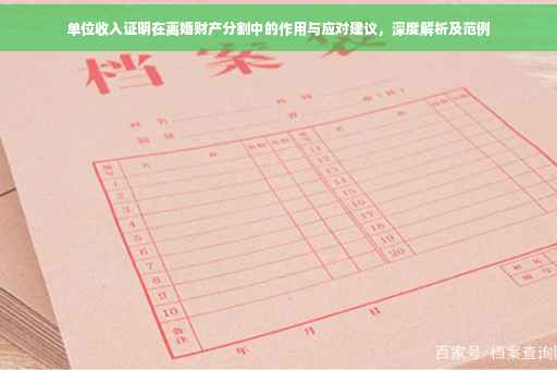 摘要:本文将探讨单位收入证明在离婚财产分割中的作用及应对建议。文章将深度解析如何将单位收入证明合理运用于离婚财产分割过程中,同时提供应对建议。帮助读者了解如何利用单位收入证明维护自身合法权益,以及在离婚财产分割中应注意的问题。
