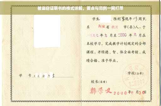 摘要:被盗窃证明书的格式对于证明物品失窃情况至关重要。该证明书通常包括标题、失窃物品信息、失窃时间地点、当事人信息以及报案情况等要点。在撰写时,应确保格式规范、内容清晰,准确描述失窃物品的特征和价值,并提供详细的失窃时间和地点信息。当事人的联系方式和报案情况也是证明书中不可或缺的部分。格式正确、内容详实的被盗窃证明书有助于失主进行维权和索赔。