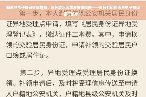 摘要:本文将详细介绍新西兰电子签证的申请流程,包括银行流水的要求和打印指南。申请者需了解银行流水在签证申请中的重要性和具体要求,以及如何正确打印和提交银行流水记录。本文旨在帮助申请者顺利申请新西兰电子签证,避免不必要的麻烦和延误。