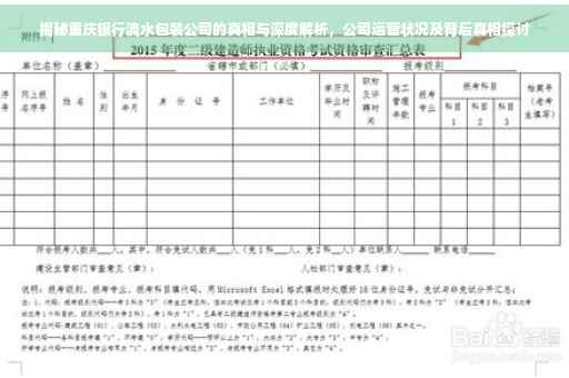 重庆银行流水包装公司深度解析:这家公司究竟如何?本文将揭示其背后的真相。我们将从多个角度评估其业务运营、服务质量等方面,带你了解这家公司的真实面貌。阅读本文,你将获得全面的信息,帮助你更好地了解重庆银行流水包装公司。