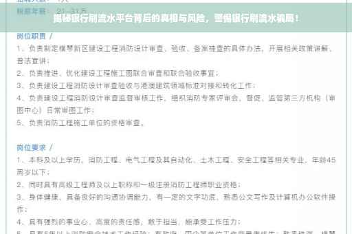 随着互联网金融的迅猛发展,银行刷流水服务逐渐进入公众视野,不少企业和个人通过银行刷流水平台,试图提高信用评级、获取贷款等,这种服务背后隐藏着诸多不为人知的真相和风险,本文将深入探讨银行刷流水平台的运作机制,揭示其背后的真相,并提醒广大用户警惕潜在风险。