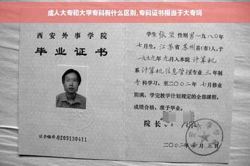 区别如下:(1)录取分数区别:通过普通高考进去的,一般需要高的高考分数,就读的是普通大专;通过成人高考进去的,一般所需分数比较低,就读的是成人大专。(2)证书区别:普通大专证书标注:****普通大专跟成人大专标注****成人大专。(3)求职时候的区别:普通大专证跟成人大专证区别在于第一次求职,如果你是第一次出来工作的,一般企业会看重求职者的毕业证书,那无疑普通大专比成人大专毕业出来的人更容易找工作。;但如果你是已经有工作经历的,那普通大专证跟成人大专证的区别就不是很大。只要你的成人大专证书是正规学院的,国家电子注册的,那就是全国通用的。扩展资料:专科一般指大学专科教育,是高等教育的重要组成部分,是大学的学历层次之一。在中国,大学专科教育主要由高职和高专承担,部分本科高校亦开设有专科。专科层次不颁发学位证书,只颁发专科毕业证书。专科学历主要分为全日制专科和非全日制专科两种。全日制专科通常是由全国各地的普通高等学校招生全国统一考试进行招生的,学制3年,学生在校学习。非全日制专科主要分为成人高等教育等多种类型,没有固定修业年限,学生既可以在相关教育机构学习也可以自学。参考资料:百度百科-专科