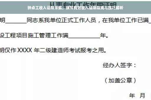 摘要:本文将详细介绍钟点工收入证明的重要性以及如何有效证明您的收入状况。通过提供清晰的收入证明,有助于个人信用建立、租赁申请、贷款申请等方面。本文将指导您如何撰写钟点工收入证明,包括必要的信息和格式要求,助您准确展示个人收入状况。关键词:钟点工收入证明、收入状况证明、写作指南。