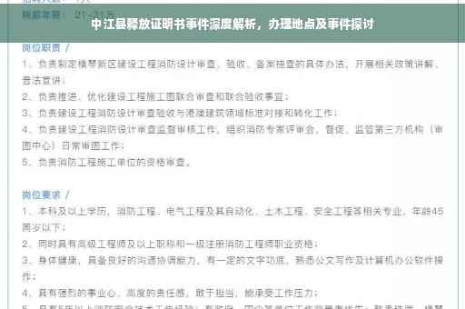 摘要:关于中江县释放证明书事件,该文深入解析了释放证明书的办理地点及流程。文章指出,释放证明书是中江县司法体系中的重要文件,其办理地点通常设在当地公安局或法院。文章还强调了释放证明书的重要性,并提醒公众在办理时需遵守相关程序和规定。该事件引发了公众对司法公正和透明的关注。