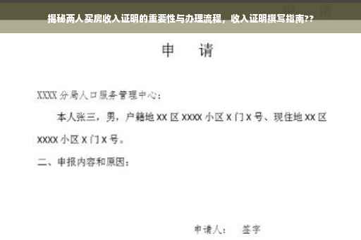 摘要:,,本文将探讨两人买房时收入证明的重要性和办理流程。收入证明是购房过程中的关键文件,有助于证明购房者的经济实力和信用状况。本文将介绍如何撰写收入证明,包括需要包含的关键信息,如个人收入、工作年限等。本文还将指导读者了解办理收入证明的流程和注意事项,帮助购房者顺利完成购房过程。