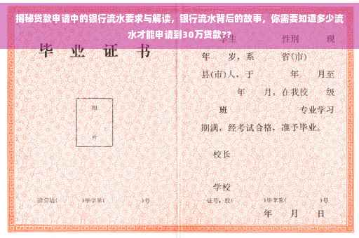 摘要:本文将揭示贷款申请中银行流水背后的故事,解读银行流水的重要性及其要求。想要成功申请到30万贷款,银行流水是关键因素之一。本文将介绍银行流水的含义、作用以及如何合理规划和准备银行流水,以便顺利获得贷款。通过本文的指导,读者可以更好地了解银行流水的重要性,以及如何满足银行流水要求,从而提高贷款申请的成功率。