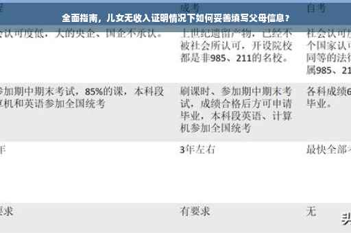 摘要:本指南全面解析了儿女没有收入证明时如何妥善填写相关信息,为父母填写信息时提供参考。针对儿女无收入证明的情况,本指南提供了一系列解决方案和建议,帮助父母正确处理相关手续,确保信息填写的准确性和完整性。