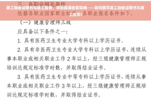 作为一名自媒体作者,今天我们将深入探讨竣工验收证明书和竣工报告的重要性,以及它们在项目完成过程中所扮演的关键角色,本文将详细解析这两个文件的内容、作用和在项目完成过程中的必要性,帮助读者更好地了解它们。